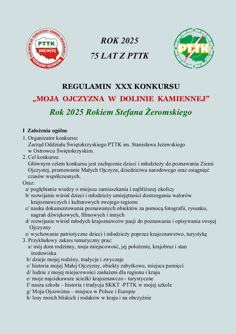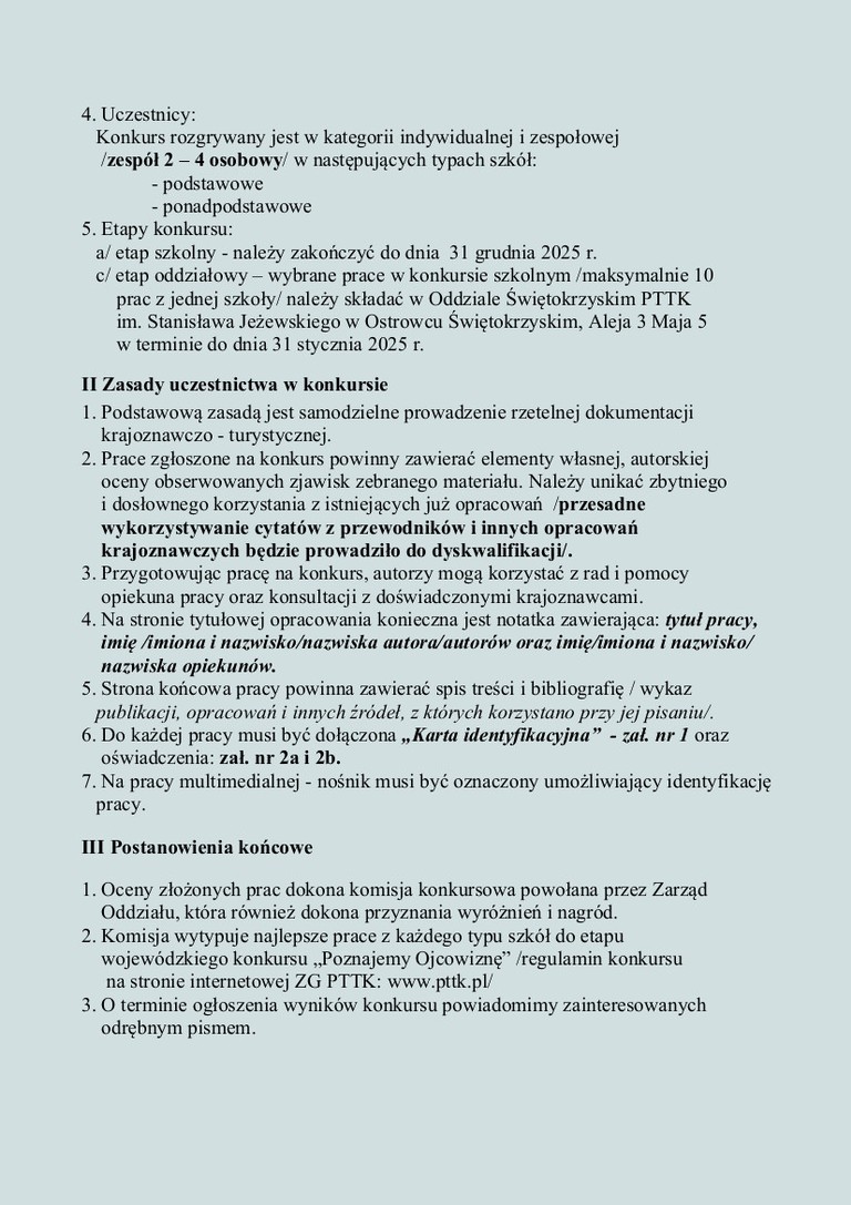 WYNIKI KONKURSU XXIX edycji „Moja Ojczyzna w Dolinie Kamiennej” – etap oddziałowy „Poznajemy Ojcowiznę” – etap wojewódzki ![]() Nagrodzone prace: - w kategorii szkół podstawowych 1. I miejsce – „Rzeka Świślina - od źródeł do ujścia" Aleksander Szczałuba - Kowalski PSP w Nietulisku Dużym 2. I miejsce – „Czarno - czerwone, czerwono - czarne" Marcelina Wojtasik PSP w Nietulisku Dużym Joanna Chodynka 3. I miejsce – "Stępem, kłusem, galopem przez ojcowiznę” Maria Łukawska PSP w Nietulisku Dużym 4. II miejsce –"Witold Gombrowicz - Moja Mała Ojczyzna" Mateusz Adamus - KPSP w Ostrowcu Świętokrzyskim - w kategorii szkół ponadpodstawowych 1. I miejsce - "Ponidzie" Maciej Ciździel - LO nr III w Ostrowcu Świętokrzyskim 2. I miejsce - "Wąchock" Mateusz Gromski ZSO Mistrzostwa Sportowego w Ostrowcu Świętokrzyskim Klaudiusz Paluch Na etap ogólnopolski wysłano następujące prace: - w kategorii szkół podstawowych 1. I miejsce – „Rzeka Świślina - od źródeł do ujścia" Aleksander Szczałuba - Kowalski PSP w Nietulisku Dużym 2. I miejsce – „Czarno - czerwone, czerwono - czarne" Marcelina Wojtasik PSP w Nietulisku Dużym Joanna Chodynka 3. I miejsce – "Stępem, kłusem, galopem przez ojcowiznę” Maria Łukawska PSP w Nietulisku Dużym - w kategorii szkół ponadpodstawowych 1. I miejsce - "Ponidzie" Maciej Ciździel - LO nr III w Ostrowcu Świętokrzyskim 2. I miejsce - "Wąchock" Mateusz Gromski ZSO Mistrzostwa Sportowego w Ostrowcu Świętokrzyskim Klaudiusz Paluch Oddziałowa Komisja Konkursowa | ||