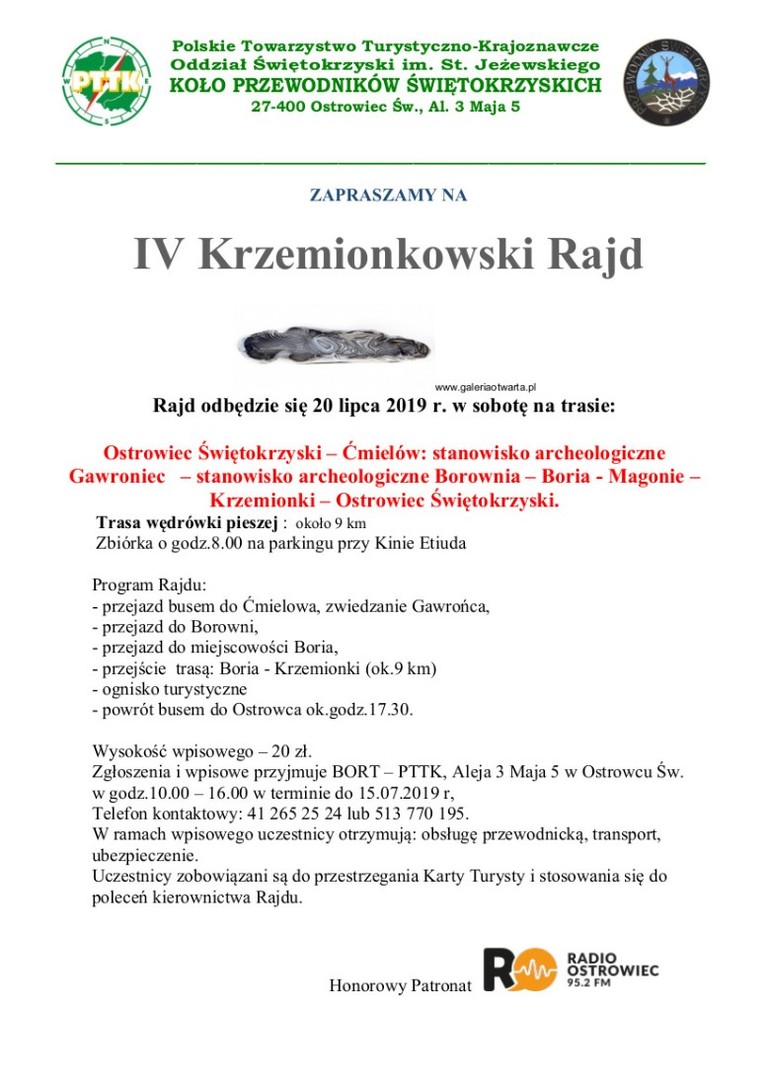 VII Rajd Krzemionkowski – w 100 lecie odkrycia neolitycznych kopalni krzemienia pasiastego w Krzemionkach Koło Przewodników Świętokrzyskich działające przy Oddziale Świętokrzyskim PTTK im. Stanisława Jeżewskiego w Ostrowcu Świętokrzyskim zorganizowało w dniach 29 – 30 lipca 2022 r VII Rajd Krzemionkowski. Obecna VII edycja rajdu, który miał do tej pory charakter wycieczek krajoznawczych, w związku z jubileuszem 100 - lecia odkrycia Krzemionek została zaproponowana w formie sesji popularno – naukowej oraz wycieczki śladami odkryć Jana Samsonowicza. Pierwszego dnia odbyły się wykłady: • ”Gospodarcze i kulturowe znaczenie geologicznych odkryć Jana Samsonowicza” – dr Sylwester Salwa i dr hab. Anna Fijałkowska-Mader; PIG – PIB Oddział Świętokrzyski • „Krzemień świeciechowski vs. krzemień pasiasty” – dr hab. prof. UMCS Jerzy Libera i dr hab. UMCS Marek Florek, • „Znaczenie górników krzemionkowskich w społecznościach schyłku neolitu i początku epoki brązu” – dr Jerzy Tomasz Bąbel W trakcie przerw kawowych i na zakończenie uczestnicy dyskutowali z prowadzącymi wykłady. W sesji uczestniczyło 64 słuchaczy. Prezydent Miasta – Jarosław Górczyński - przekazał dla wykładowców upominki promujące Ostrowiec Świętokrzyski, a dla prezesa Oddziału Świętokrzyskiego PTTK dyplom gratulacyjny. | ||