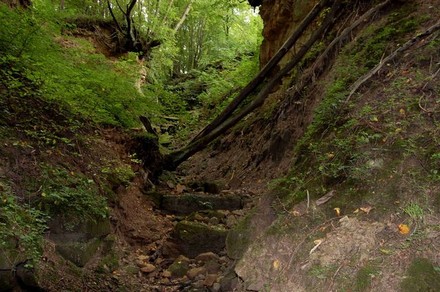 -wąwóz skalny i głaz narzutowy, wejście do wąwozu od drogi Kunów - Chmielów;